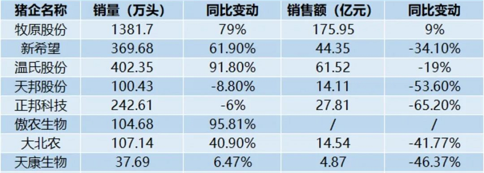 受猪价下行影响,绝大部分猪企销售收入也出现大幅下滑。