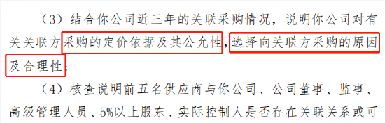 深交所还要公司结合近三年的关联采购情况,说明对有关关联方采购的定价依据及其公允性,选择向关联方采购的原因及合理性。最后要求其核查说明前五名供应商与公司、公司董事、监事、高级管理人员、5%以上股东、实际控制人是否存在关联关系或可能造成利益倾斜的其他关系。