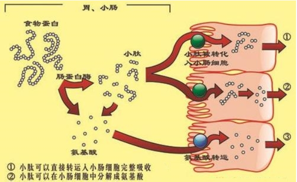 肽被肠细胞吸收,以肽形式存在的氨基酸似乎比游离氨基酸吸收要快。关于肽在肠上皮细胞的胞液中是被分解还是完整透过进入循环系统这个问题,