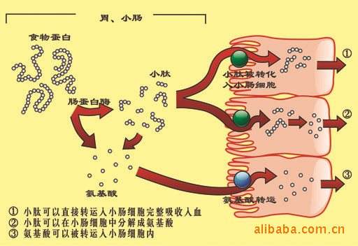 吸收利用。小肽的吸收与游离氨基酸相比具有以下特点:小肽中氨基酸残基的吸收速度大于等量游离氨基酸的吸收速度;小肽能直接提高氨基酸在体内的吸收速度,减少氨基酸之间的拮抗作用,显着改善