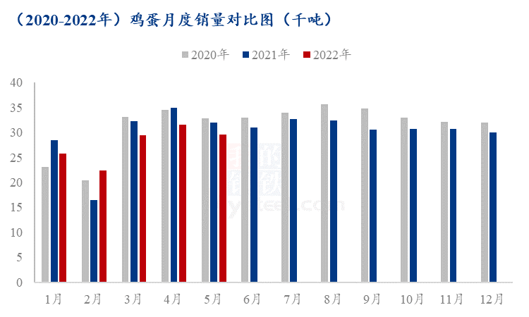 上图可见,据Mysteel农产品数据统计显示,6月份鸡蛋月均销量环比降幅6.23%,同比降幅7.81%,需求表现较弱,随着中高考结束,6月份各地高校陆续开始放假,高校停止补货,不仅需求端再次减弱明显,学校供应端的货源也会流向市场,对市场形成一定冲击。