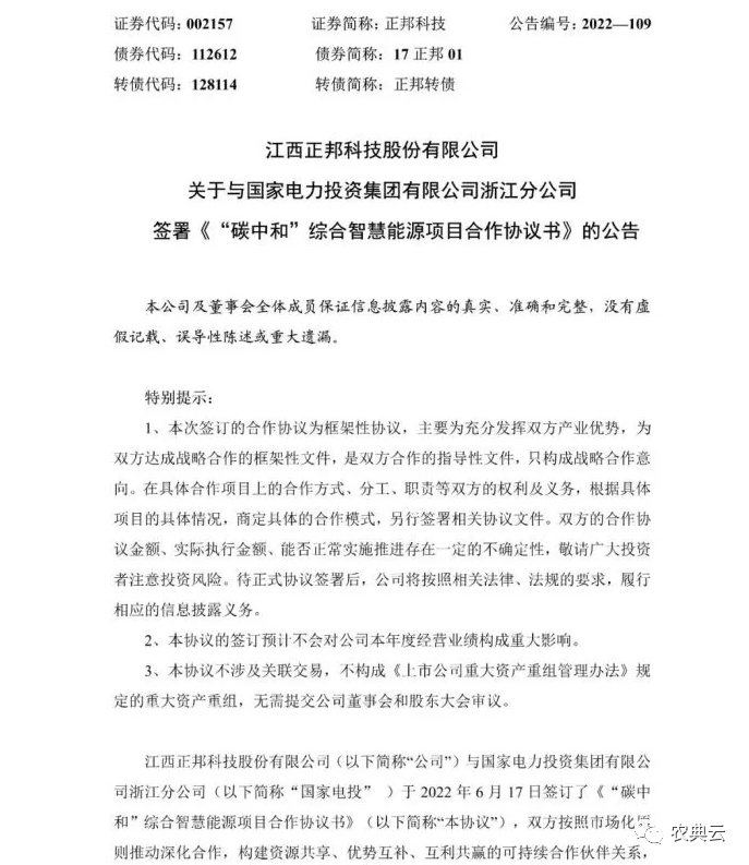 6月17日晚间,江西正邦科技股份有限公司(以下简称“正邦科技”或“公司”)发布《关于与国家电力投资集团有限公司浙江分公司签署《“碳中和”综合智慧能源项目合作协议书》的公告。